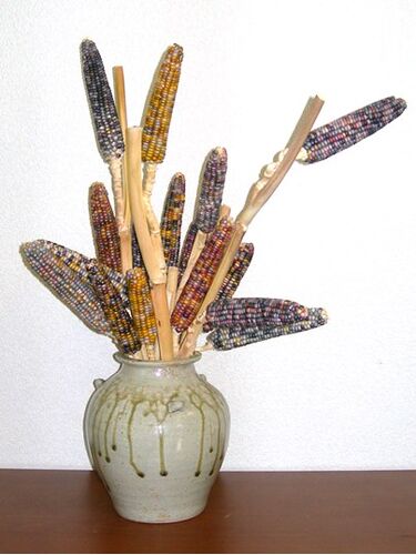 実家のおじいさんからもらった花びんに、収穫したグラスジェムコーンを入れ、我が家の玄関に飾っています。 花びんは、いろいろなタイプのものが作られていて、高さ50㎝を超えるような大きいものもあります。 壁掛け 青磁 透かし彫り 飴釉に白萩釉の上掛け …