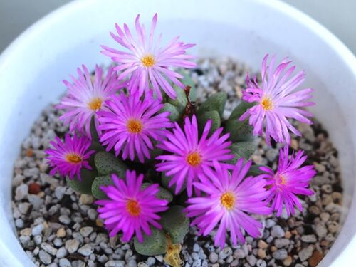 コノフィツムは玉型メセンの仲間で、冬型の多肉植物です。 冬が生長期で、夏は休眠します。 9月頃に休眠から覚めると脱皮し、その後、鮮やかな花を咲かせます。 花色は赤、オレンジ、黄、白、ピンク、紫ととても豊富です。 葉の形も丸型、足袋形、コマ型、鞍…