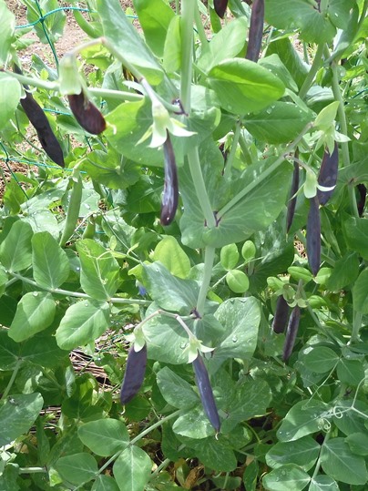 スナップエンドウは収穫を始め、紫色の実エンドウは豆が大きくなってから収穫します。