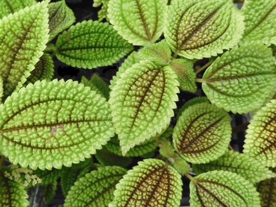 葉の表は、薄緑色に暗ブロンズ色の模様が入ります。