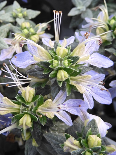 花は2.5㎝程の唇形で、雄しべ、雌しべが長く外に突き出し、カーブを描いています。