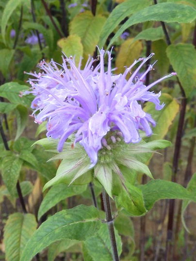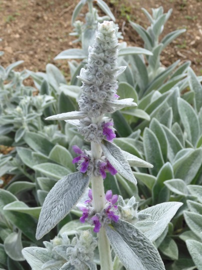 畑では、ダイナースカモミールとタイム、ブルーサルビア、モナルダ、ミント、ヤロウ、ラムズイヤーの花が咲いています。