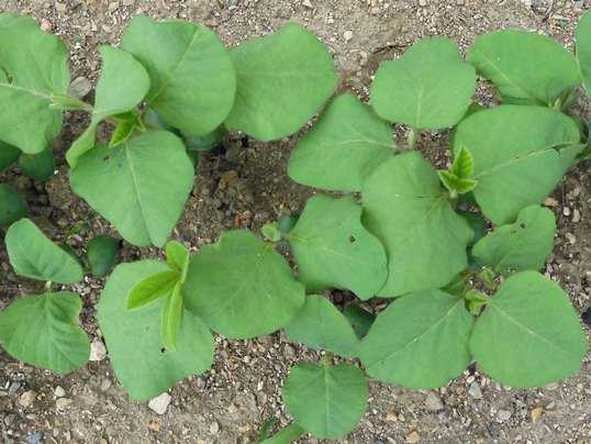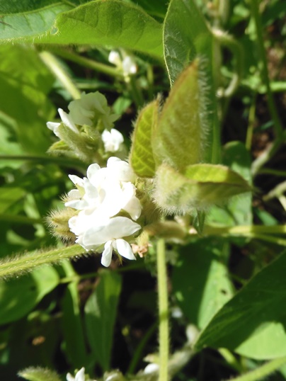 以前、育てた黒大豆の花は薄紫色でしたが、今回の豆の花は白色です。