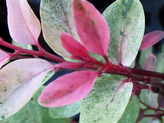 葉色はピンク、白、緑と美しく、新芽は濃いピンクで、緑の葉には白斑が入ります。